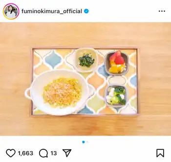 日々の手料理を自身のインスタグラムで披露している木村。この日は「チビうさごはん」と題して「アルファベットパスタのミートソース、ブロッコリーとカリフラワー、ほうれん草の海苔和え、いちご、甘平」と我が子への手料理を紹介した。