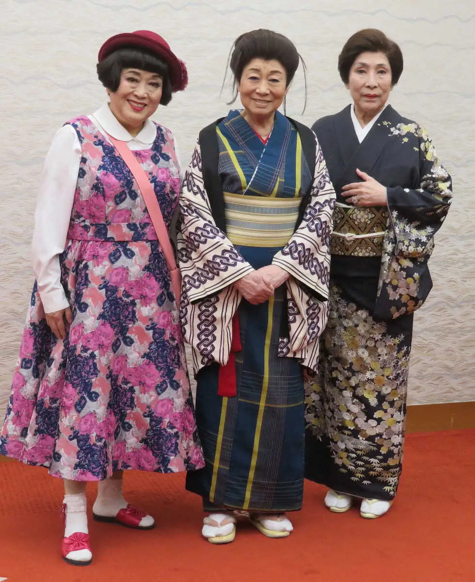 舞台「三婆」のゲネプロ前に、衣装で取材に応じた(左から)渡辺えり、水谷八重子、波乃久里子