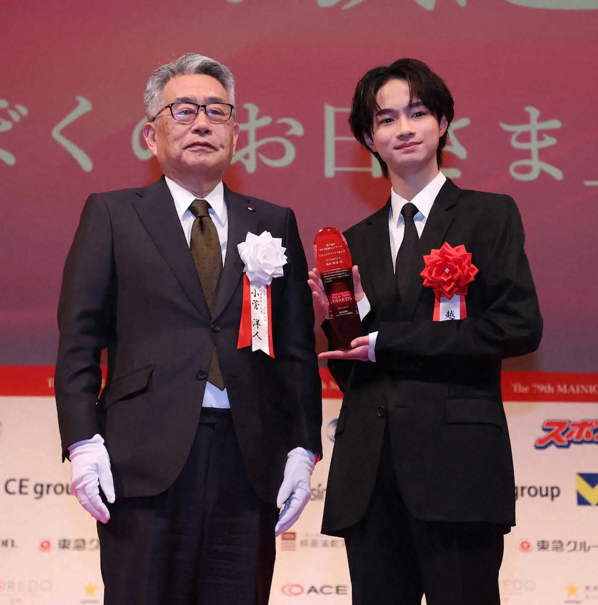 越山は「名誉ある賞をいただけてうれしく思います」と喜びいっぱい。「この作品は、僕にとって初めての主演映画で、学ばせていただくこと、経験させていただくことがたくさんありました。僕をこの場に立たせてくださった監督、池松さんはじめキャストの皆さん、スタッフの皆さん、この映画を見てくださった観客の皆さん、そして毎日映画コンクールの関係者の皆さん、本当にありがとうございました」と感謝した。