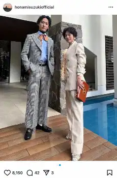 鈴木はベージュのスーツに大きなフリルのリボンタイのついたシャツ、上杉はグレンチェックのスーツに青いシャツを合わせたコーデをそれぞれ着こなした。鈴木は「それにしても上杉君の、何を着てもサマになることよ」と弟をべた褒めした。