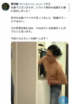 お笑いトリオ「鬼ヶ島」野田勉の公式X(@onigasima_vocal)から 「鬼ヶ島」野田勉が結婚発表「結婚がゴールではない」離婚歴ある相方の言… ギャラリーで見る この記事のフォト 2025年02月14日の画像一覧 もっと見る 2025年02月14日の画像をもっと見る