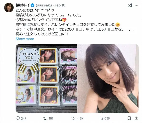 1990年代前半に一世を風靡した桜樹ルイ(55)が14日までに自身のSNSを更新。近影とともにオリジナルのバレンタインチョコを披露した。