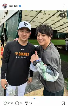 上地雄輔 巨人の沖縄キャンプ訪れ超人気選手と2ショット「推し×推し」の声 横浜高後輩とも