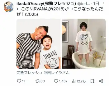 また、グラビアに挑戦したレイラが、同じデザインのTシャツを着ている写真も投稿し「←このNIRVANAが(2018)が→こうなったんだぜ!(2025)」と、あどけない氷上のレイラと、バスタブの中に立つ大人っぽい表情のレイラの写真を並べた。