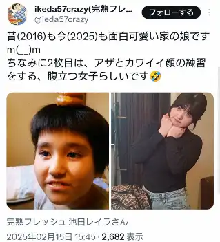 お笑いコンビ「完熟フレッシュ」の池田57CRAZY(49)が15日までに自身のX(旧ツイッター)を更新。娘で相方の池田レイラ(19)の“ビフォーアフター”を披露した。