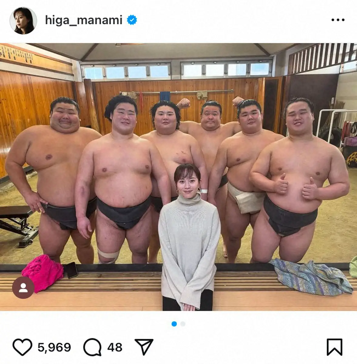相撲部屋で撮った力士6人との写真を公開した比嘉。「わたしの最強SP軍団」とつづり、ハッシュタグで「相撲」「立浪部屋」と付け加えた。ストーリーズでは「漂う、女将感。」と感想を述べた。
