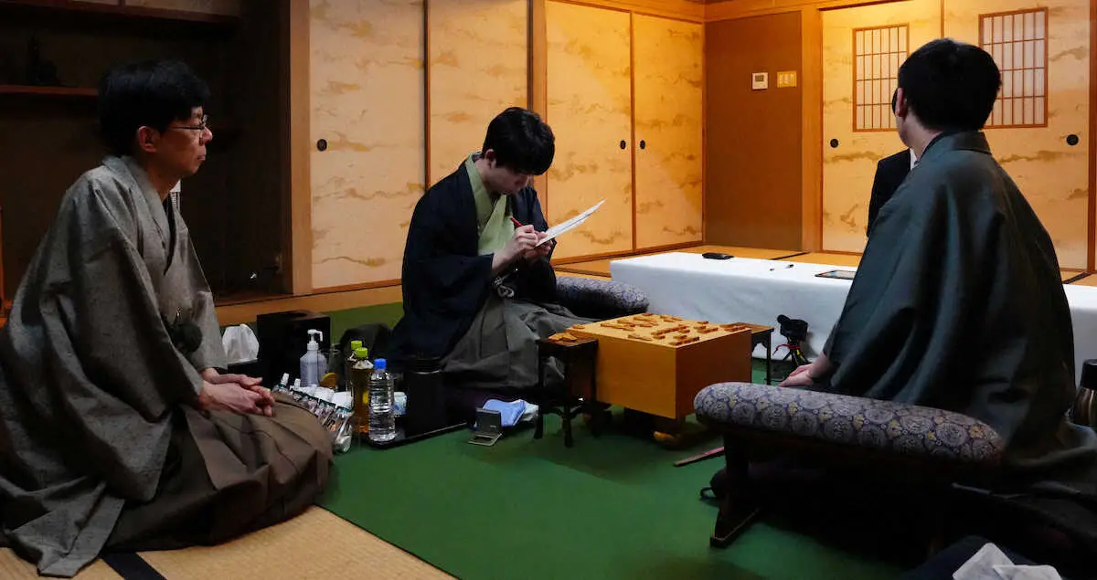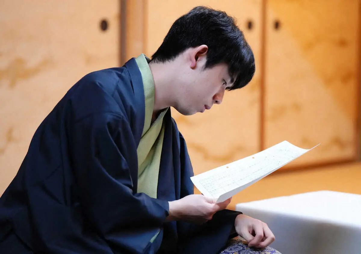 <ALSOK杯第74期王将戦第4局・第1日>初手を指す藤井聡太王将(左)(撮影・大城 有生希)
