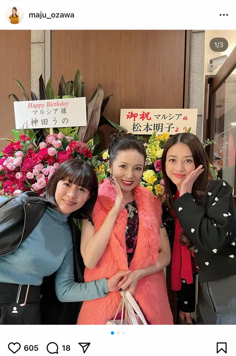 小沢は「先日のバレンタインデーは、マルシアさんのお誕生日で、バースデーライブがありました たま姉と行ってきました」とし歌手のマルシア、タレントのさとう珠緒とともに3ショットを披露。