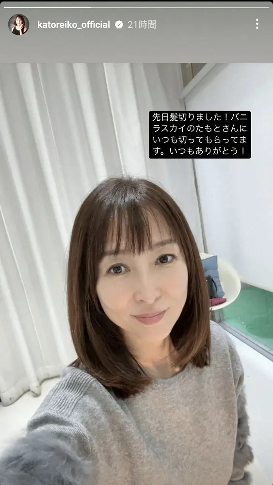 タレントのかとうれいこ(55)が16日までに自身のインスタグラムを更新。髪をカットした最新ショットを披露した。