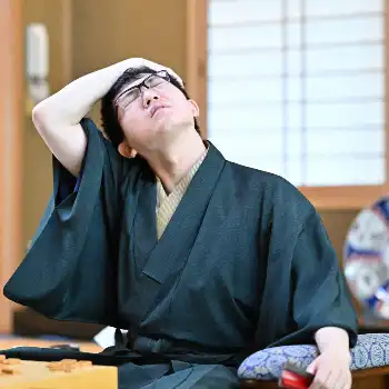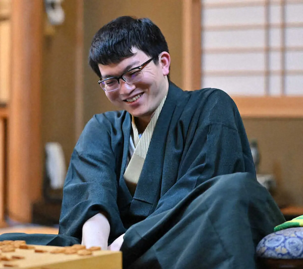 <ALSOK杯第74期王将戦第4局・第2日>初勝利を挙げたこに扮して笑顔でポーズを決める永瀬九段(撮影・大城 有生希)