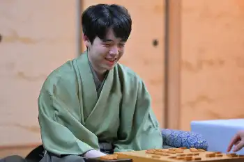 <ALSOK杯第74期王将戦第4局・第2日>熟考する藤井王将(左は谷川十七世名人)(撮影・大城 有生希)