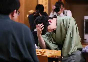 <王将戦第4局 藤井聡太王将・永瀬拓矢九段>感想戦で頭を抱える藤井王将(撮影・岩崎 哲也)