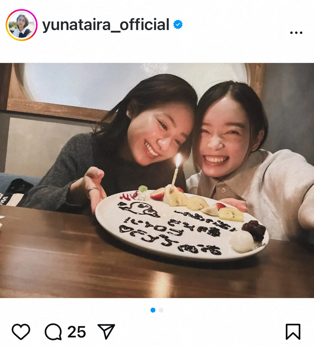 平はお化けの絵文字とともに2枚の写真を投稿。お祝いのプレートを手にした女優の高石あかりとの顔寄せショットや、プレートに笑顔を見せる高石のショットになっている。