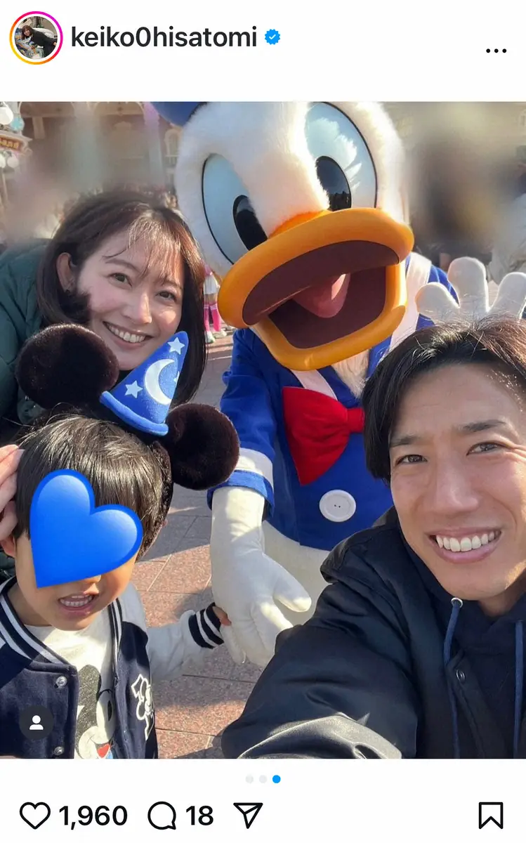 久冨アナは「家族で夢の国へ」と投稿し、ドナルドダックと一緒の家族ショットをアップ。東京ディズニーリゾートへ出かけたことを報告した。
