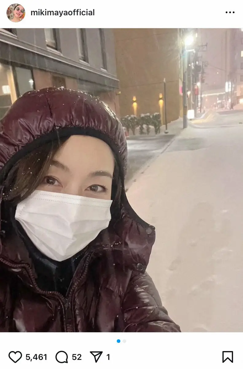 「雪の札幌に来ております」と書き始めた真矢。「いゃ~口が回らないけど、ダウンコートのフードを被りこなしてザックザックと雪を踏み締め歩いております」と続け、雪の降る屋外での自撮り写真を公開した。