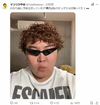 お笑いコンビ「マユリカ」の中谷(35)が20日までに自身のX(旧ツイッター)を更新。予約注文していたサングラスが届き、人気漫画キャラに変身した姿を披露した。