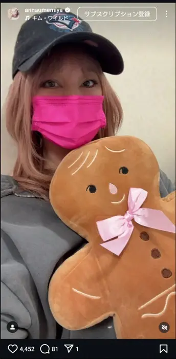 「乳がんの治療は長く、髪の毛がキチンとなるまでにはまだまだ時間はかかりますからウィッグは必要でした」とし、「そして、毎回病院にはマイマクラや、ジンジャーブレッド君を持って行くんです。気分が上がるから そうやって気持ちを工夫をしています マスクは、@privatestocklabs」と、ピンクのマスク姿でジンジャーブレッドマンのぬいぐるみを抱いているショットなどをアップした。