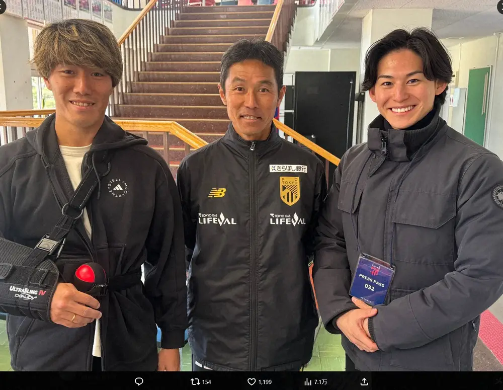 「ユースの時にお世話になった、FC東京の松橋力蔵監督にお会いする事ができました」と書き出すと、松橋監督と自身、FC東京MF遠藤渓太との3ショットをアップ。