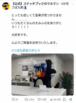 スケッチブックでお馴染みの文具メーカー「マルマン」が20日、公式X(旧ツイッター)を更新。ヤクルトの超人気マスコット「つば九郎」の担当者の訃報に、哀悼の意をつづった。