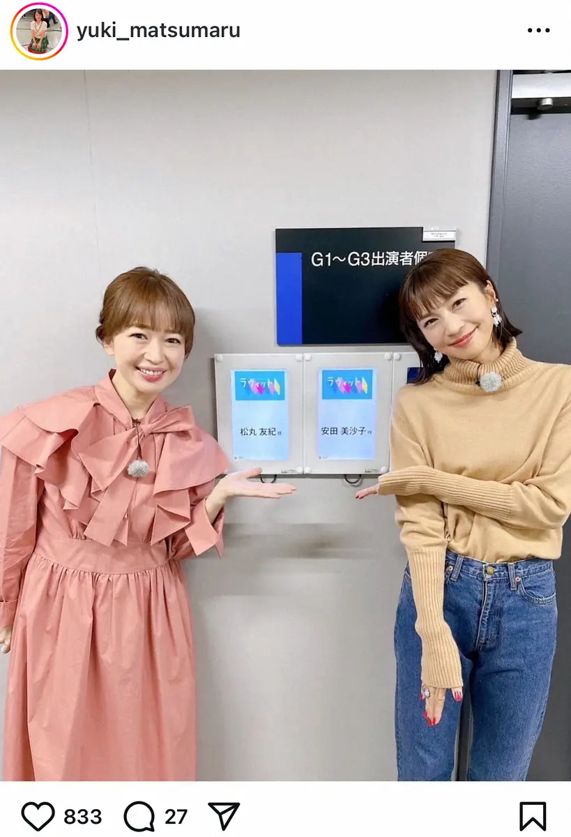 元テレビ東京でフリーアナウンサーの松丸友紀(43)が、21日までに自身のインスタグラムを更新。日頃から親しくしている女性タレントとの共演を喜んだ。
