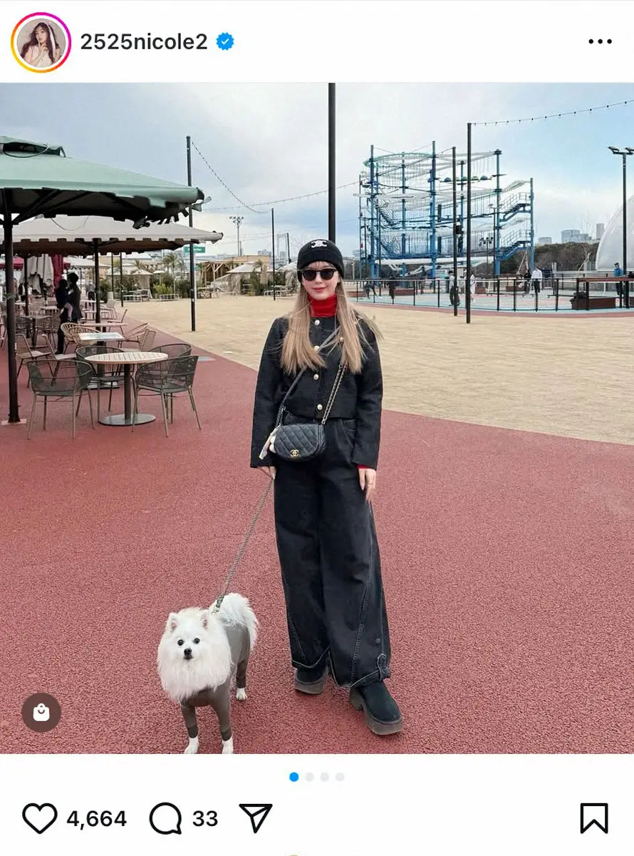 愛犬は日本スピッツ。この日は茶色の洋服の着ているため、白いもふもふの毛はボリュームダウン。ニコルは黒のアウターに黒のボトムス、黒のニット帽にブーツと黒コーデを披露。差し色で赤のタートルネックのニットをのぞかせた。