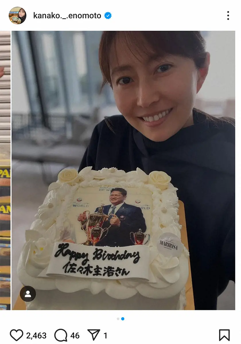 また、佐々木氏の写真がデコレーションされたケーキも手に笑顔のショットも投稿した。