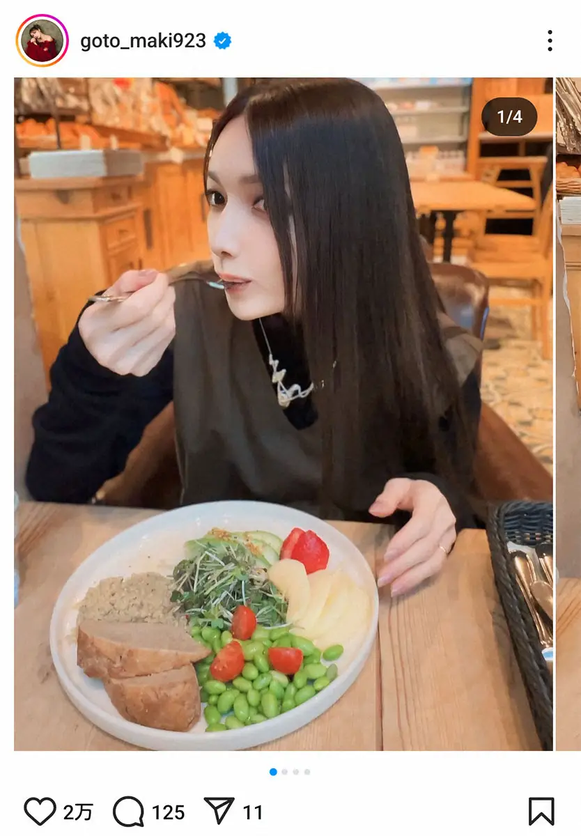 後藤は「仕事の合間にランチしたよ~美味しかった~」とつづり、野菜とフルーツたっぷりのランチを食べている写真を投稿。