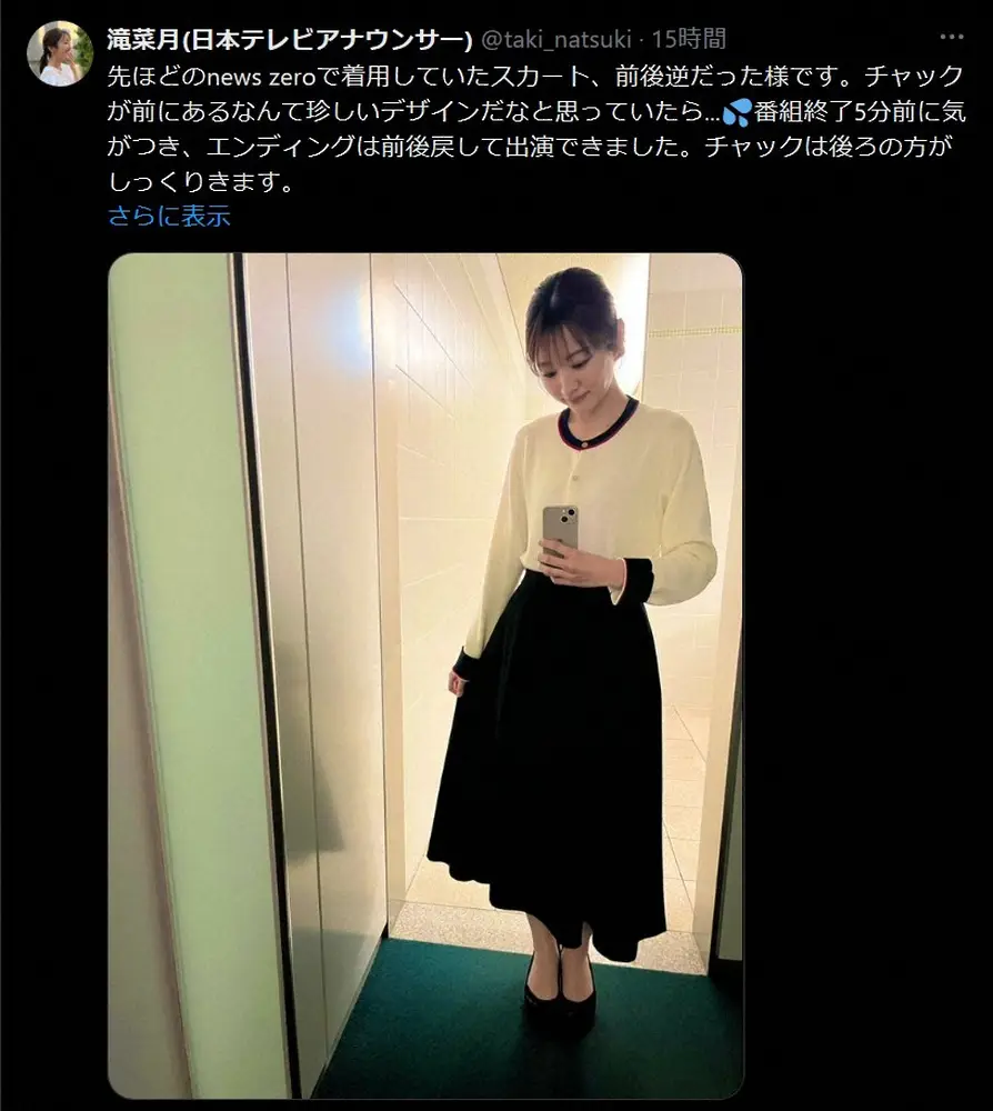 「先ほどのnews zeroで着用していたスカート、前後逆だった様です」と明かすと、白のカーディガンに黒のスカートの番組衣装姿の自撮りショットをアップ。