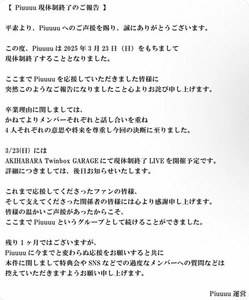 運営は「これまで応援してくださったファンの皆様、そして支えて下さった関係者の皆様には心より感謝申し上げます。皆様の温かいご声援があったからこそ、ここまでPiuuuuというグループとして続けることができました」と感謝。一方で、「本件に関しまして特典会やSNSなどでの過度なメンバーへの質問などは控えていただきますようお願い申し上げます」と呼びかけた。
