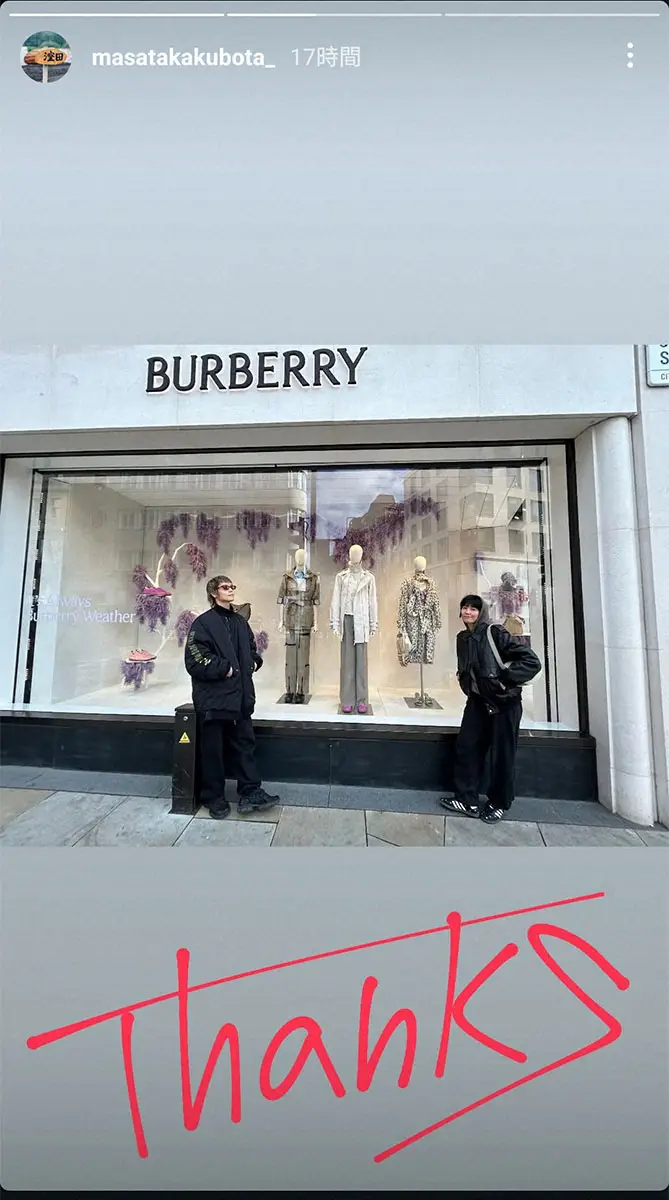 この日は2人ともブラックコーデでバーバリーのショップの前に立つショットを投稿したもので、窪田は「Thanks」とつづっている。ショーウインドーには、実際2人が着ていた衣装も飾られている。