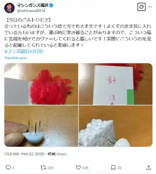 「【今日のごみトリビア】尖っているものはこういう捨て方でも大丈夫です!」とつづり、赤い羽根に「針 注意」と書かれた紙を添付している写真や、画びょうを発泡スチロールに刺している写真をアップ。