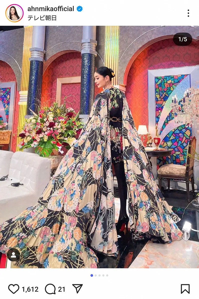 モデルでタレントのアンミカ(52)が27日、自身のインスタグラムを更新。昨年4月に亡くなったブライダルファッションデザイナー・桂由美さんデザインのゴージャスなドレス姿を公開した。