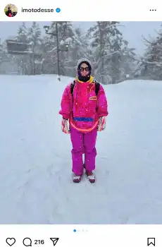 この日「久しぶりに家族で鳥取に帰省」したことを報告すると「とんでもない大雪のタイミング 実家で20年前のスキーウエア借りました これはこれでヴィンテージスタイル この格好でずっとうろちょろしてました」とド派手なピンク色のトップスに紫色のパンツを着た完全防寒スタイルを披露。