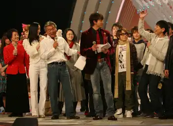 2005年、紅白歌合戦のリハーサルで司会みのもんた(左から3人目)は和田アキ子(右端)に声をかける
