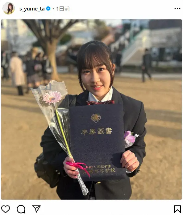 夢は「高校卒業しました!!」とつづり、堀越高校の卒業証書を手にした記念写真をアップ。「いろいろあって濃かったけど、あっという間だったな。毎日苦しくなるくらい笑って、楽しい日々を過ごすことができたので、今は卒業が寂しくて仕方ないです。寂しいって思える環境に居れたことが幸せですね」と高校生活を振り返った。