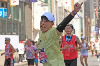 小島の目標は、自己ベストの記録・3時間59分59秒の更新。ギャグを連発しながら、終盤にはゴールドリボン活動にちなんだゴールドパンツ姿で走り、3時間53分36秒でゴールした。