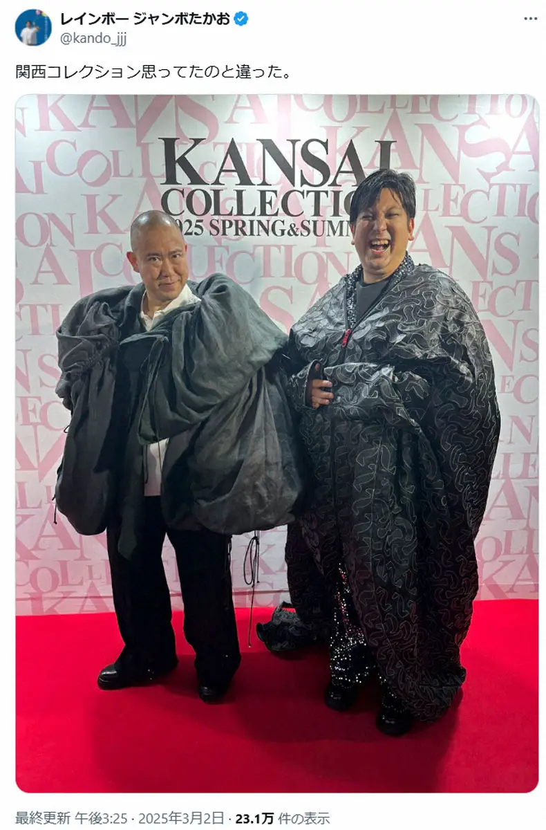 お笑いコンビ「レインボー」のジャンボたかお(35)が2日、自身のX(旧ツイッター)を更新。大阪・京セラドームで開催されたファッションイベント「関西コレクション2025 SPRING&SUMMER」(関コレ)に出演し、オフショットを公開した。