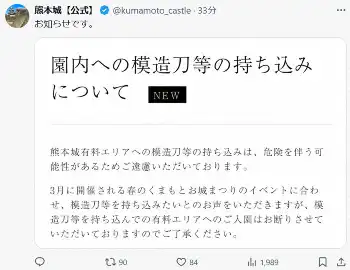 熊本城 模造刀などの持ち込み要望の声に「危険を伴う可能性があるためご遠慮いただいております」
