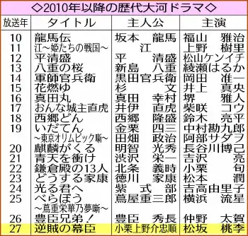 幕末に勝海舟のライバルと言われながら、明治新政府に「逆賊」と見なされ歴史の闇に葬られた小栗上野介忠順(おぐりこうずけのすけただまさ)の生涯を描く作品。幕臣として日本の近代化を進めようと国内外の諸勢力と外交や情報戦を繰り広げていく。27年は生誕200年を迎える節目となる。