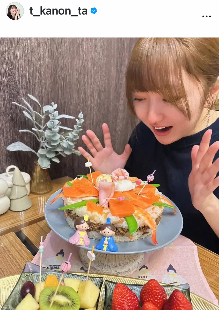 「昨日は雛祭りでしたね」とつづり、自身のショットを投稿。「我が家では毎年恒例のちらし寿司ケーキ 美味しかったです」とつづった。