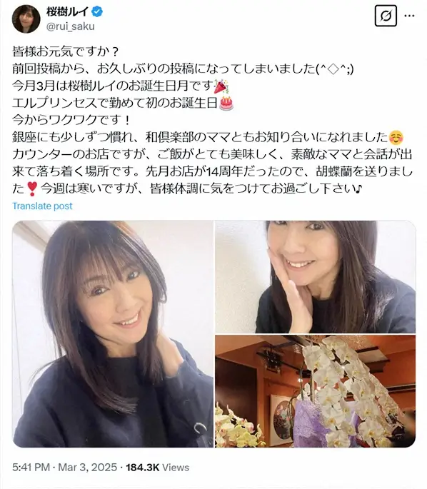 近影などをアップし、「エルプリンセスで勤めて初のお誕生日 今からワクワクです!銀座にも少しずつ慣れ、和倶楽部のママともお知り合いになれました カウンターのお店ですが、ご飯がとても美味しく、素敵なママと会話が出来て落ち着く場所です。先月お店が14周年だったので、胡蝶蘭を送りました!今週は寒いですが、皆様体調に気をつけてお過ごし下さい」とつづった。