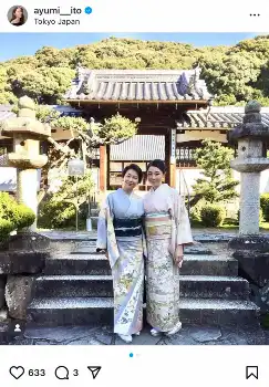 「大好きな中山美穂さんとご一緒させていただいた【NHKBSプレミアムドラマ『平成細雪』】が今週日曜から4週に渡って再放送されます」と報告した伊藤。中山美穂さんとの着物姿のツーショットやオフショットを公開した。