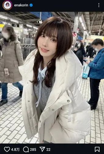 「名古屋でロケ収録でした 今日めっちゃ寒くなかった…!?」とつづり、駅のホームでの、白と水色のブラウスにグレーのニット、白のダウンジャケット姿のロングヘア・ショットをアップした。
