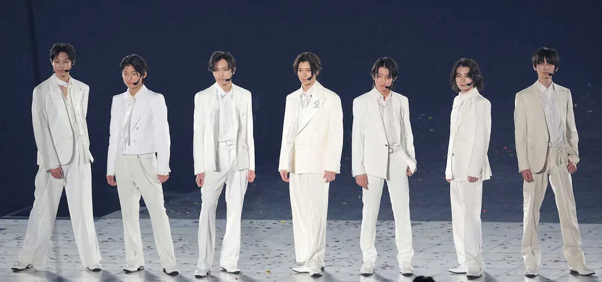 <to HEROes ~TOBE 2nd Super Live~>パフォーマンスする(左から)Number_iの岸優太、平野紫耀、神宮寺勇太、北山宏光、三宅健(撮影・松永 柊斗)