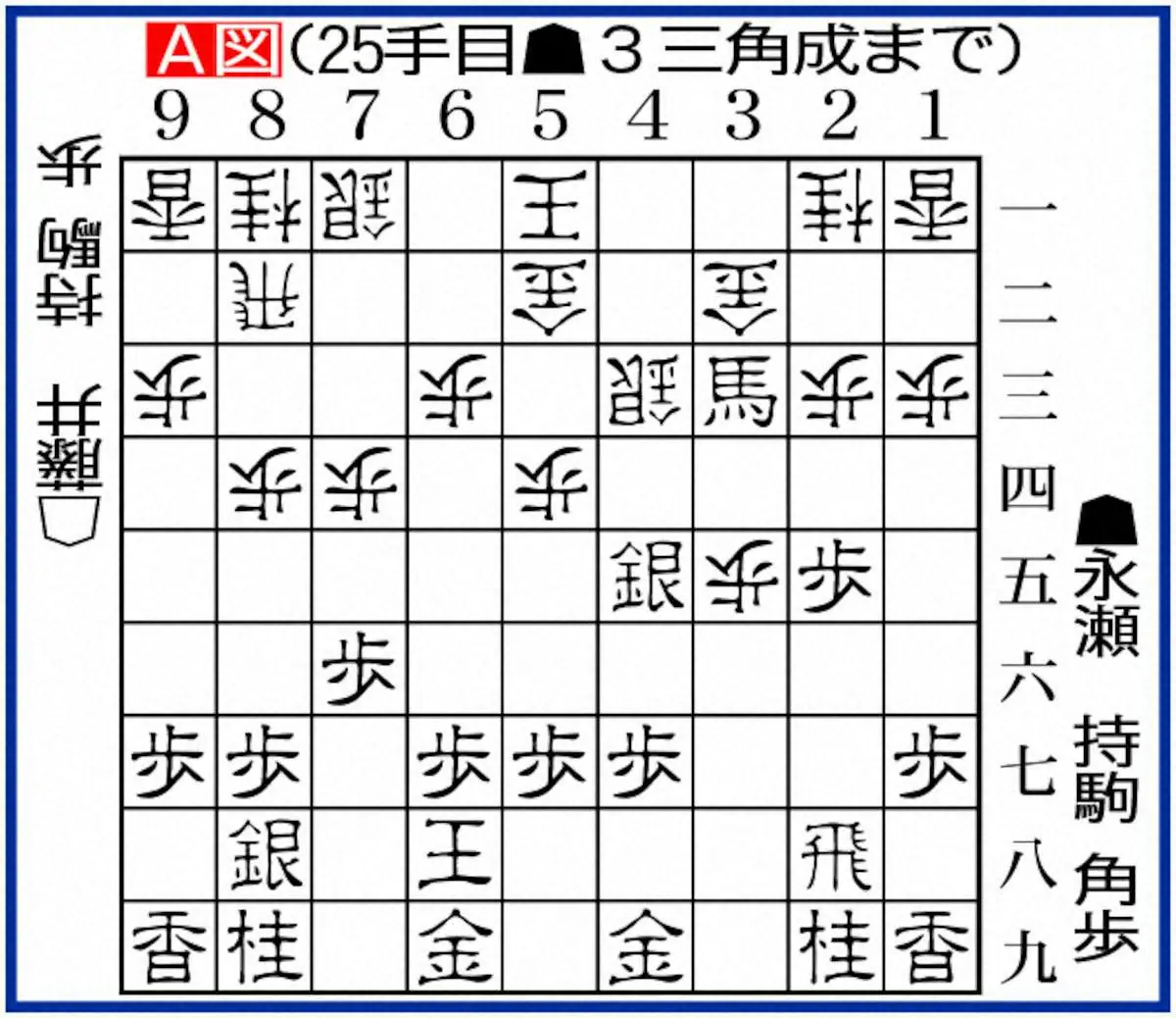 対して永瀬は早々に▲3六歩と突き▲3七銀~▲4六銀と急戦の構えを見せ、▲3五歩と開戦。素直に△同歩は▲同銀で棒銀が成功するので藤井は△4五歩と反発。以下▲同銀△3五歩と突き違いの手筋で応戦する。いったん攻め足が止まった局面で永瀬の3手一組が面白かった。▲3三角成(A図)と角を交換し△同桂に▲5六銀と引き上げる。通常は後手を引くので指しにくいが、桂馬を跳ねさせて3四の地点に空間をつくったのが主眼の構想。