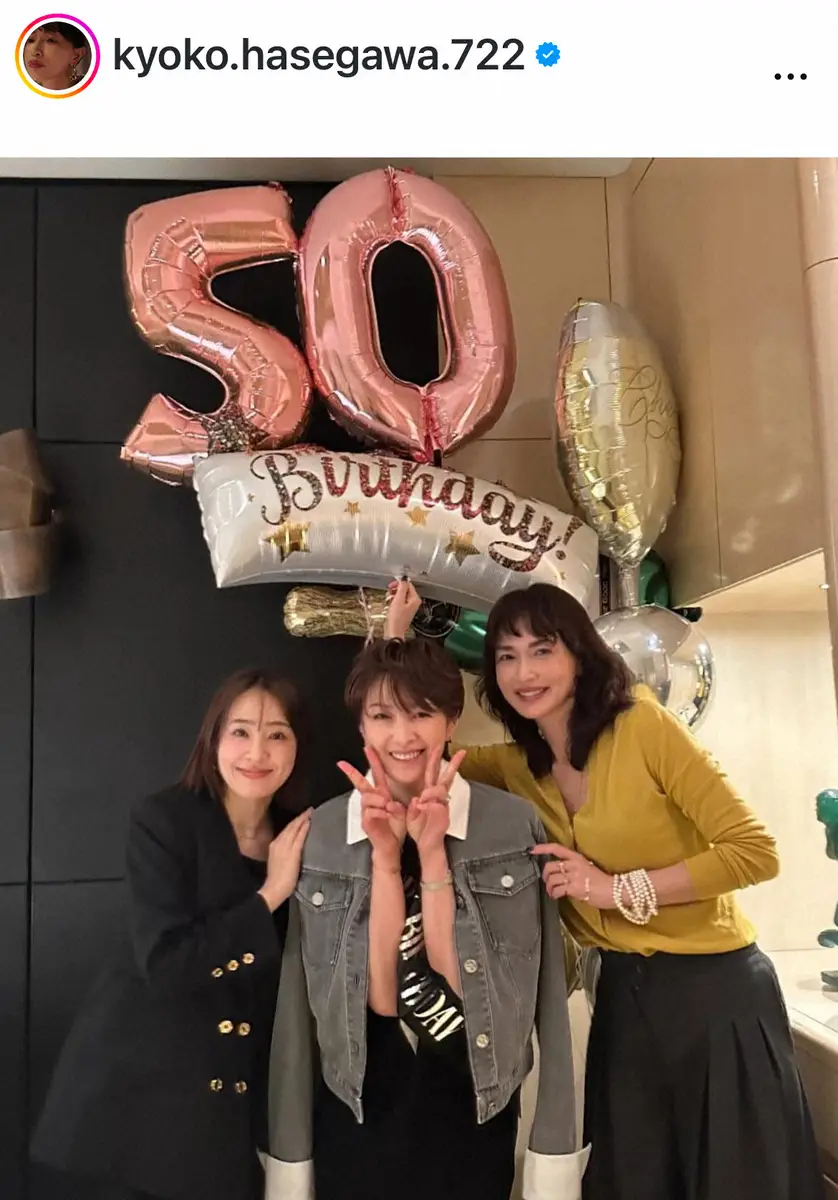 長谷川は女優の吉瀬美智子、タレントの大沢あかねとのスリーショットを投稿。「50」「Birthday」のバルーンも飾られており、「お誕生日おめでとう」と大沢とともに吉瀬の誕生日を祝ったことを報告した。