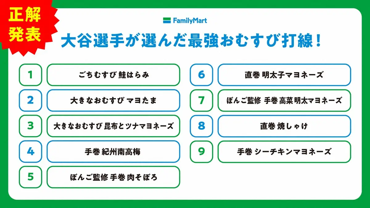 ファミリーマート「おむすびアンバサダー」を務めるドジャース・大谷翔平(C)ファミリーマートPR事業部 Photo by 提供写真 大谷翔平が采配!“おむすび打線”「1番と7番迷った」「梅で…」ファミマ「お… ギャラリーで見る この記事のフォト 2025年03月10日の画像一覧 もっと見る 2025年03月10日の画像をもっと見る