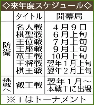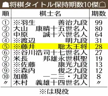 王将戦の連覇を4へ伸ばした。大山康晴十五世名人、中原誠十六世名人、谷川浩司十七世名人、羽生善治九段に続く5人目。谷川の27期に棋王戦で並び、今回単独5位へ浮上した。2日制タイトル戦も初登場から15期連続獲得した。第4局で敗退し、2日制先手番での連勝こそ32で止まったが、適性を改めて示した。