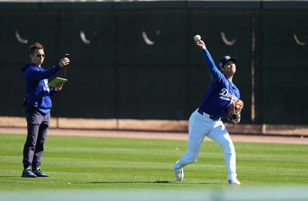 大谷は9日(日本時間10日)、捕手役を座らせて投球練習を行った。壁当てなどルーティンをこなした後、グラウンドの芝生で座ったキャッチボール相手に、カットボールやツーシームをまじえて21球の調整投球。回転数などを計測する機器ラプソードを使って、1球ごとに球筋を確認した。トーマス・アルバート・ヘッドアスレチックトレーナーが計測する中、途中からマーク・プライアー投手コーチ、コナー・マグギネス投手コーチ補佐も視察に訪れ、大谷と一緒にデータを確認して笑顔を見せる一幕もあった。