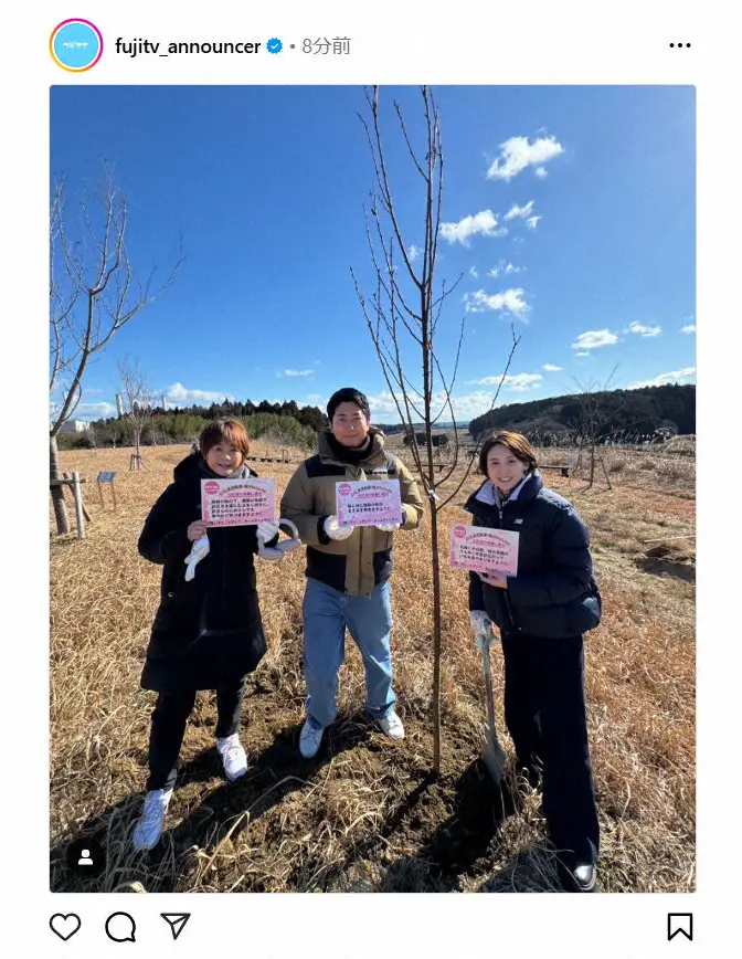 久しぶりの更新は同局の宮司愛海アナによるもので、「宮司です!先日、福島県広野町へ桜の植樹に行ってきました」と報告。「東日本大震災で地震や津波、放射能の影響を受けた福島県に「30年後に子どもたちが誇れる桜並木を作りたい」との思いからスタートした「ふくしま浜街道・桜プロジェクト」。青空の下、福島に、そして被災地に、桜の開花と共に笑顔の花も開くよう願いを込めながら植えました」「また、見に行きたいと思います」とつづった。